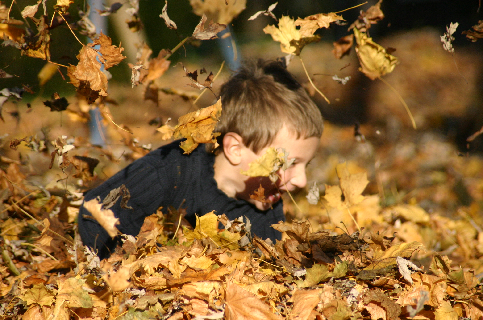 Gabriel playing in a pile of golden leaves at Ollie and Dottie Perrys in Indian Mills New Jersey